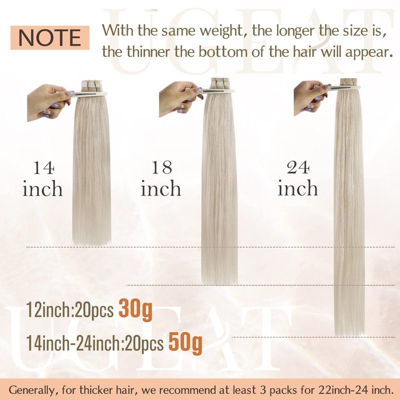 - 【Specifications】Each package of Ugeat Tape in Hair Extensions contains 20 pieces, with each piece weighing between 1.5-2.5g. The length of the extensions ranges from 14-24 inches, allowing you to choose the perfect length for your desired hairstyle.
