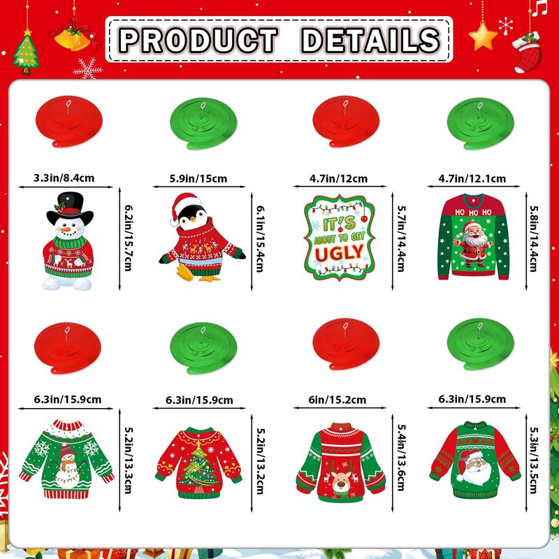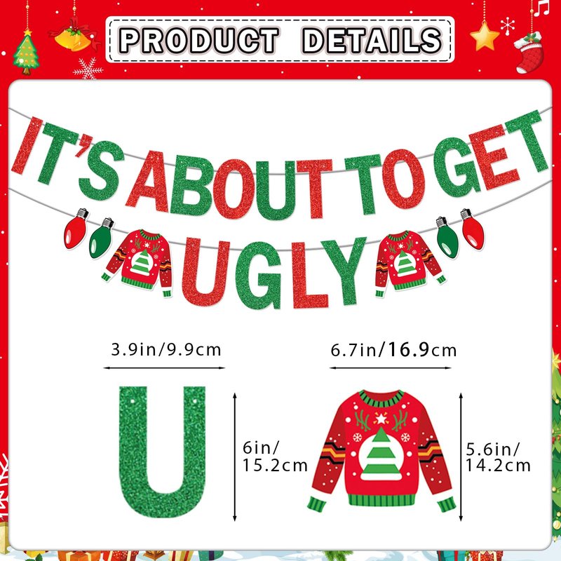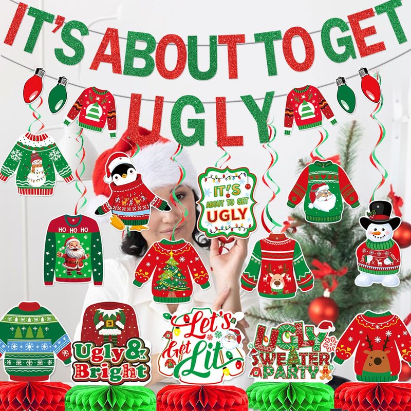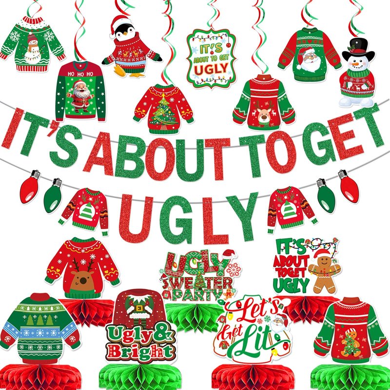 - Package includes: 1*IT’S ABOUT TO GET UGLY Banner, 7*ugly sweater theme centerpieces and 8*ugly sweater hanging swirls. Perfect for ugly sweater Christmas party decor.