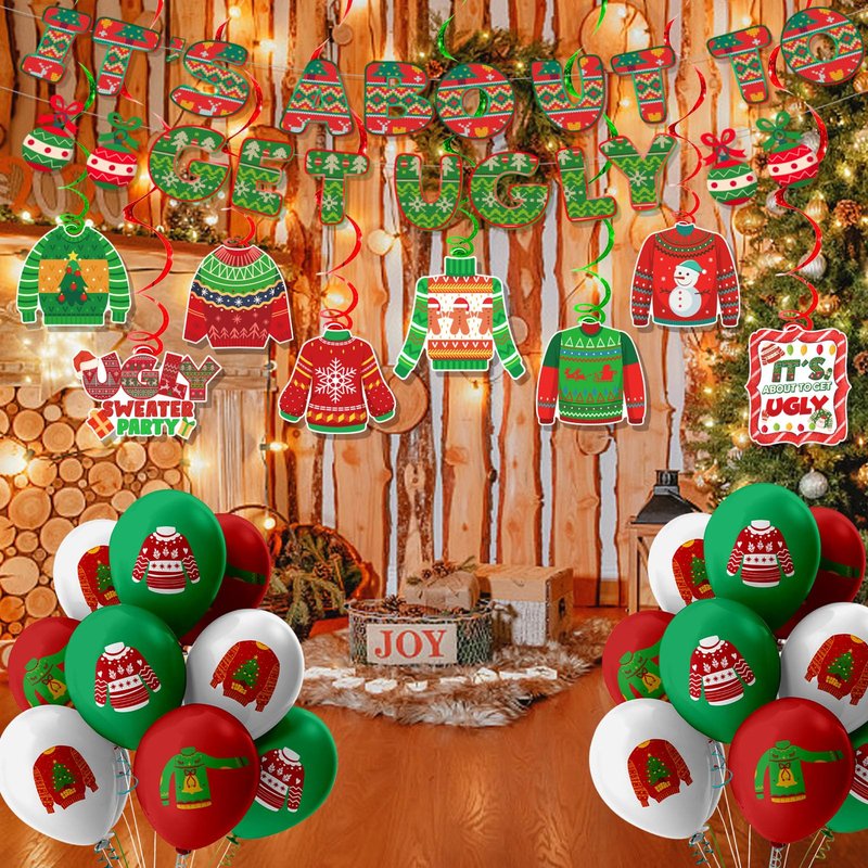 - 🎅Abundant Ugly Sweater Party Decor: you will get 1pcs It's About To Get Ugly Banner,8pcs ugly sweater hanging swirls, 18 pcs ugly sweater latex balloons for satisfying your needs of festival or daily use