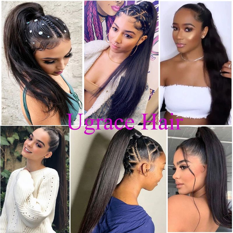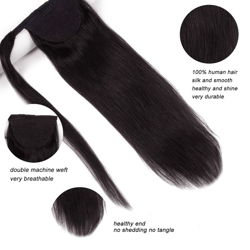 Ugrace Hair Ponytail Extension Human Hair Ponytail Extension For Black Women Clip In Ponytail Hair Extensions Wrap Around Long Ponytail Straight One Piece Hairpiece Hair(16 inch, Natural Black #1B)