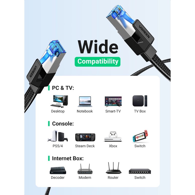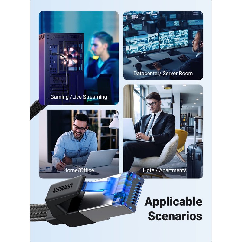 UGREEN Cat 8 ethernet cable has 3FT, 6FT, 10FT, 15FT, 26FT, 50FT and other lengths. You can choose the most suitable length according to your needs. Widely Compatible