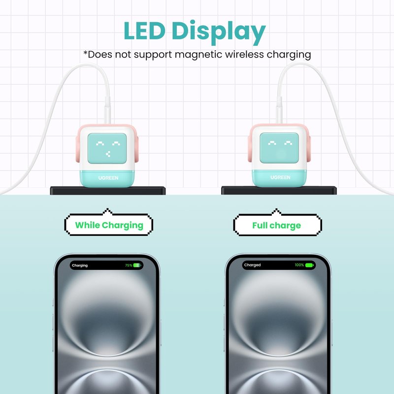 - UGREEN Uno charger: UGREEN creative series charger, robot shape, LED screen, showing different interesting expressions according to different charging status. Its feet are magnetic and can be stuck on the refrigerator or computer without getting lost( Note: The expression will only appear when the power is on.)