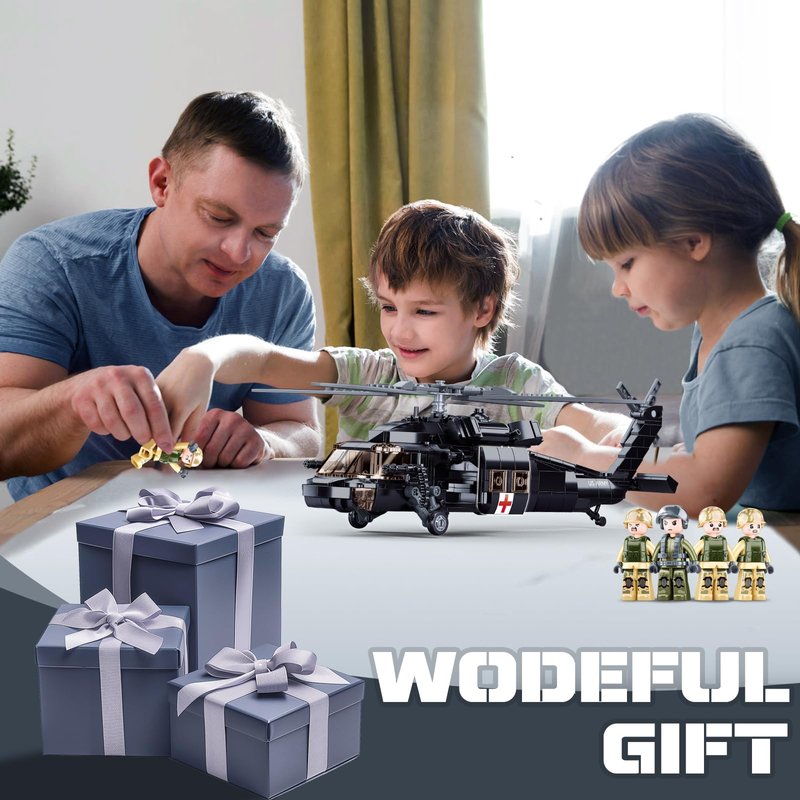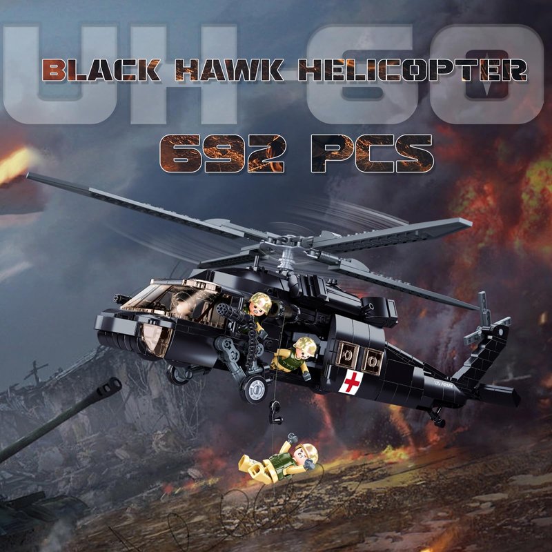 - UH-60 Helicopter Building Set: The UH-60 Black Hawk Rescue Helicopter Model boasts a highly detailed and authentic design, perfectly capturing the iconic look of this legendary WW2 military helicopter. Including four soldier minifigures and various accessory equipment, crafted with precision, every aspect—from its sleek fuselage to the intricate rotor blades—mirrors the grandeur of the original, making it an absolute must-have for both military enthusiasts and model collectors alike.
