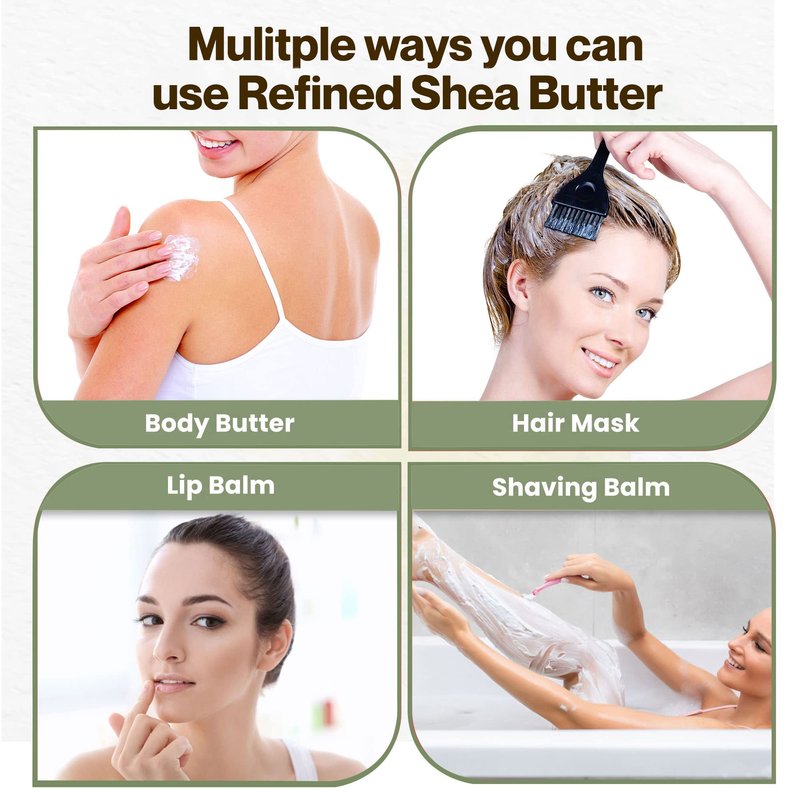 - Versatile Use: Our refined shea butter can be used as a moisturizer, a hair conditioner, or as a base for DIY skincare recipes. It is a natural and safe alternative to conventional lotions and creams that often contain harsh chemicals and synthetic fragrances.
