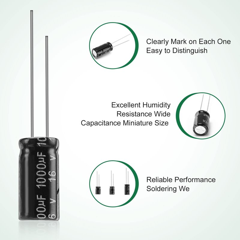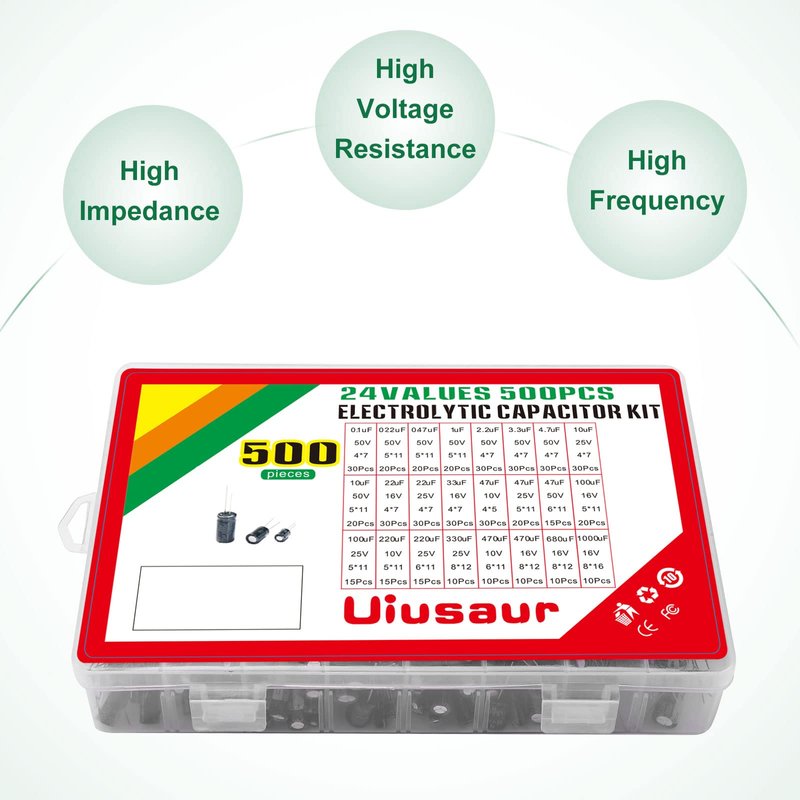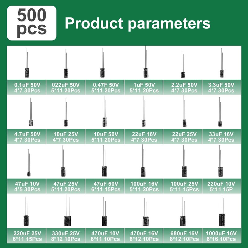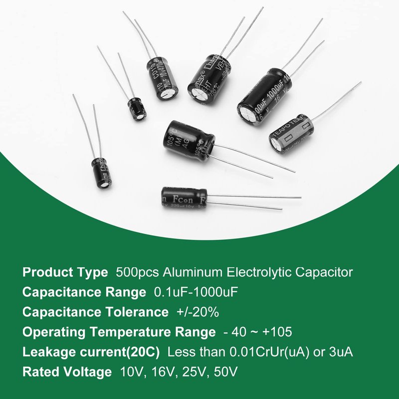 - In the set combination, 500 pieces of 24 kinds of electrolytic capacitors, including 10V 16V 25V 50V, from 0.1uF to 1000uF, capacitor combinations suitable for various applications. Excellent moisture resistance, miniature size, and wide capacitance.