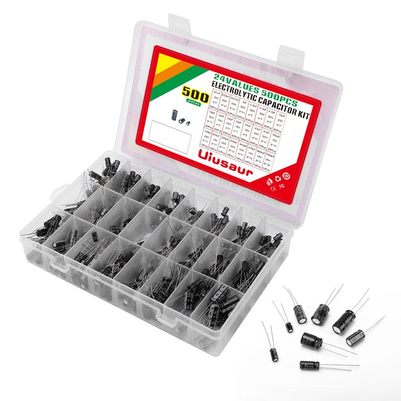 Uiusaur 500Pcs 24 Different Electrolytic Capacitors Range 0.1uF - 1000uF Combo Kit.