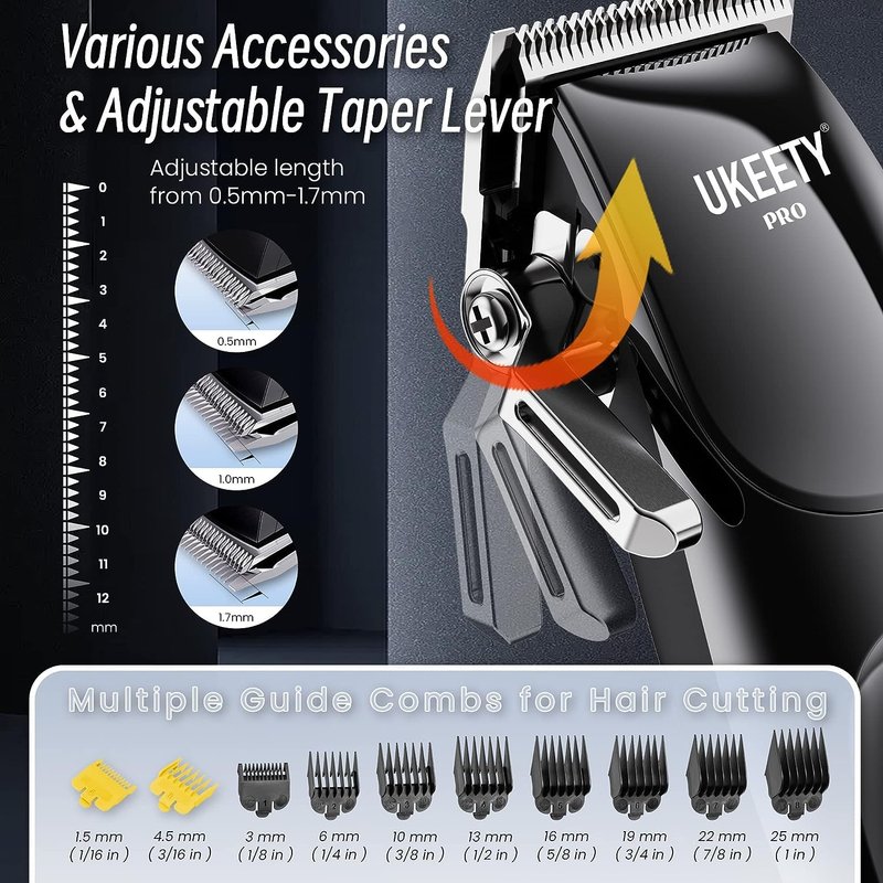 - Adjustable Taper Lever 0.5mm-1.7mm: Adjustable taper lever offers precise control. The combination of the guide combs and adjustable taper lever allows you easily adjust the length and cut out the hairstyle you want. The zero-gapped T-blade is made of high-quality stainless steel, perfect for precise trimming, grooming, sideburns, and lining. Even for beginners are easy to get started.