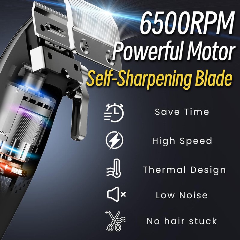 - Low Noise & Powerful Motor: Our professional hair clipper and trimmer are equipped with a high-performance rotary motor 6500RPM. Which can provide smooth clipping and long-lasting use time. Powerful enough to cut through thick hair with no pulling or snagging. No additional heat producing. Equipped with the latest noise reduction technology makes the noise less than 60 decibels. Very suitable for children.