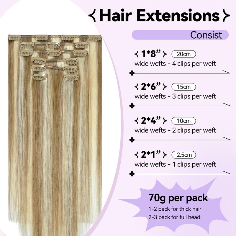 - 【Real Human Hair Extensions Clip ins Specification】-- blonde hair extensions clip in real human hair, 7pcs 70g with 16 clips per set, 15 Inch, #18P613 Ash Blonde Mixed Bleach Blonde. ❤️According to your own hair volume, just to thicker your hair, advice buy 1-2 sets; want to full head, advice buy 2-3 sets. When the weight is the same, the longer size will be thinner than the shorter size a feeling of.