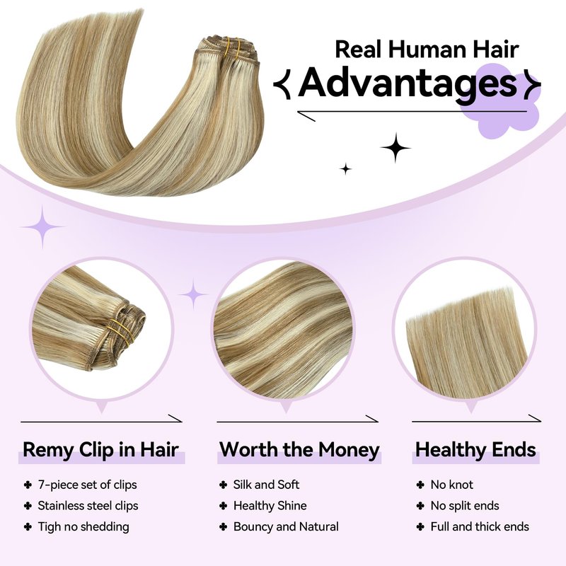 - 【High Quality Clip in Hair Extensions Real Human Hair 】-- 100% remy human hair extensions Clip ins. As smooth and soft as your own hair, tangle-free and non-shedding. Clip in hair extensions can add volume and length or highlights to your own hair, blending perfectly with your own hair. Our hair extensions can be washed, cut, dyed, straightened and curled to your liking.
