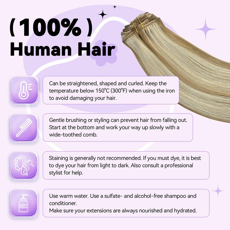 - 【Human Hair Extensions Clip ins Tips】-- Properly care for hair extensions to maintain softness and shine. Use mild shampoo and conditioner. When dyeing, it is recommended to dye darker colors, and it is not recommended to dye light colors. Please control the temperature below 180℃ when re-styling. Hair extensions can last approximately 3-4 months with good care.