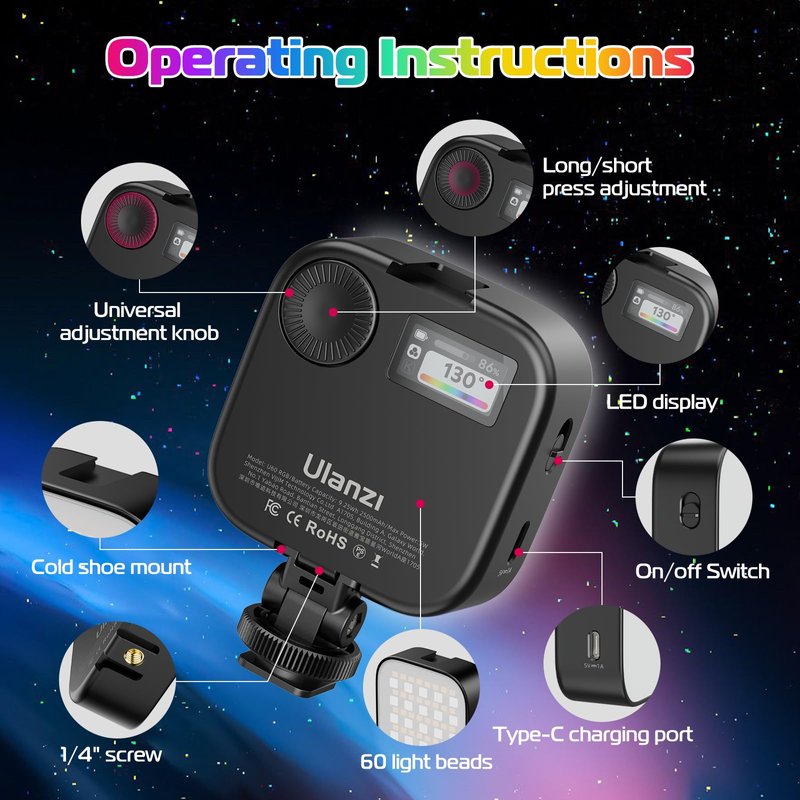 3 Ways to Mount: ULANZI U60 RGB Selfie Light with quick release Clip,Max.Clip Width 0.78in/2cm, the clamp incredibly stable, not easily falls down, widely applicable to various iPhone or android cellphone, iPad, tablet, laptop, ect. The photography light is equipped with the 1/4-inch screw that can be attached to a camera, tripod, microphone mount, light stand or other, also support using a quick release cold shoe adapter on the bottom.