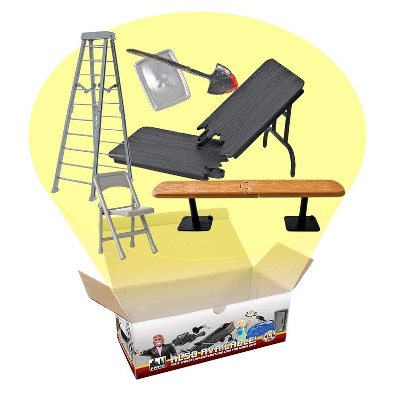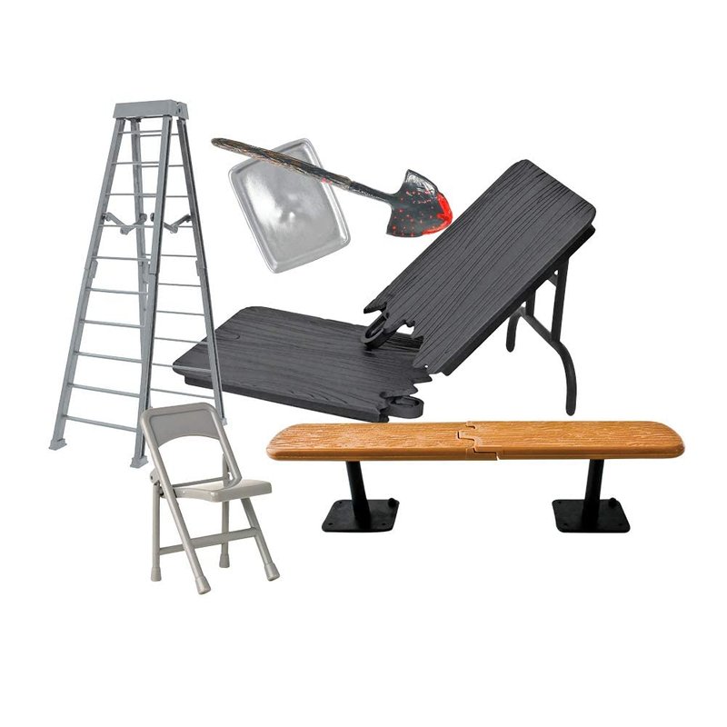 - This versatile set includes six essential accessories to bring realism and excitement to your matches: one folding chair for intense strikes, one shovel for hardcore brawls, one tray for added drama, one breakable bench for high-impact moments, and one breakable ladder for high-flying stunts.