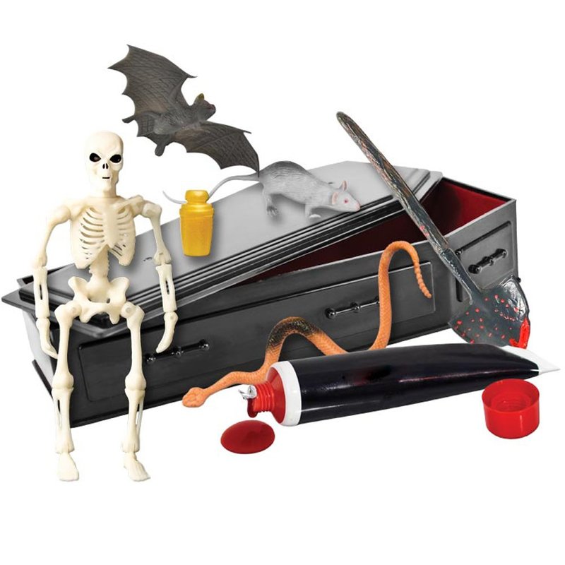 - This eerie set includes a detailed black coffin perfect for buried alive matches, a creepy skeleton figure ready to haunt the ring, a bloody shovel for those grim tasks, an urn, a tube of fake blood for added realism, and a collection of creatures including a bat, rat, and snake to complete the haunting scene.