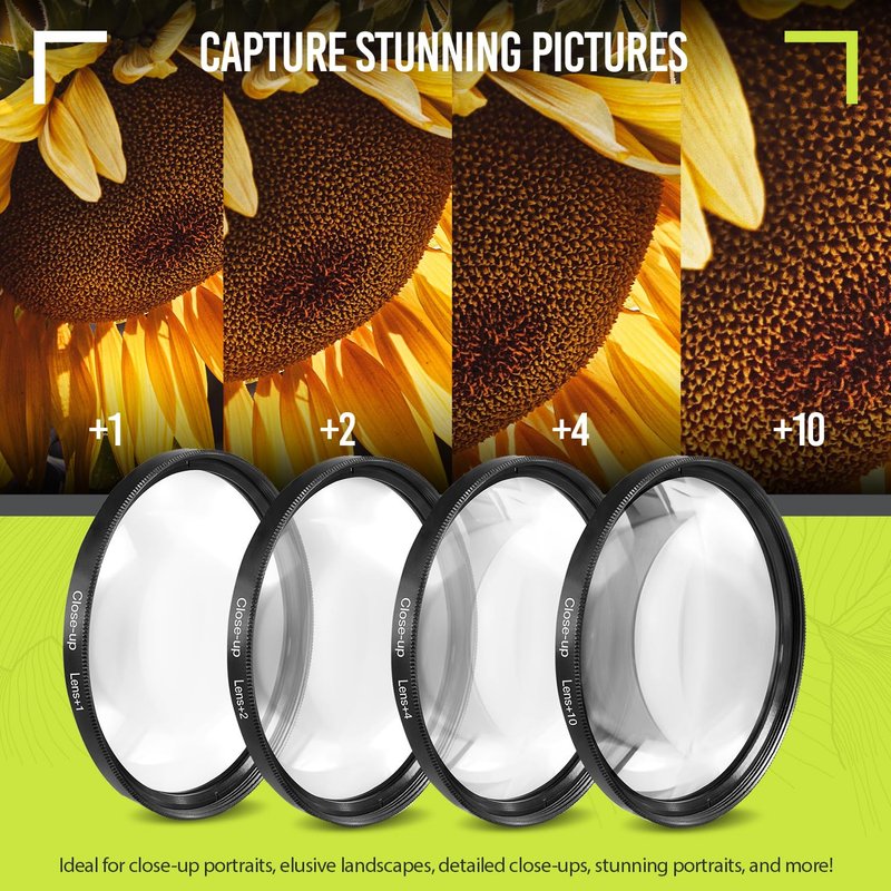 Become a more versatile photographer by exploiting this lens kit’s macro capabilities. The 58mm 4pc close-up filters also offer macro filters for canon cameras, enabling stunning close-up shots with fine detail. The 58mm macro lens helps accentuate texture and pattern in your subjects, effectively contributing depth and detail to photos. Whether you're dabbling in the world of macro photography or a seasoned professional, this macro lens filter set is a must-have addition to your camera filters not only for Canon, but other camera models, too.