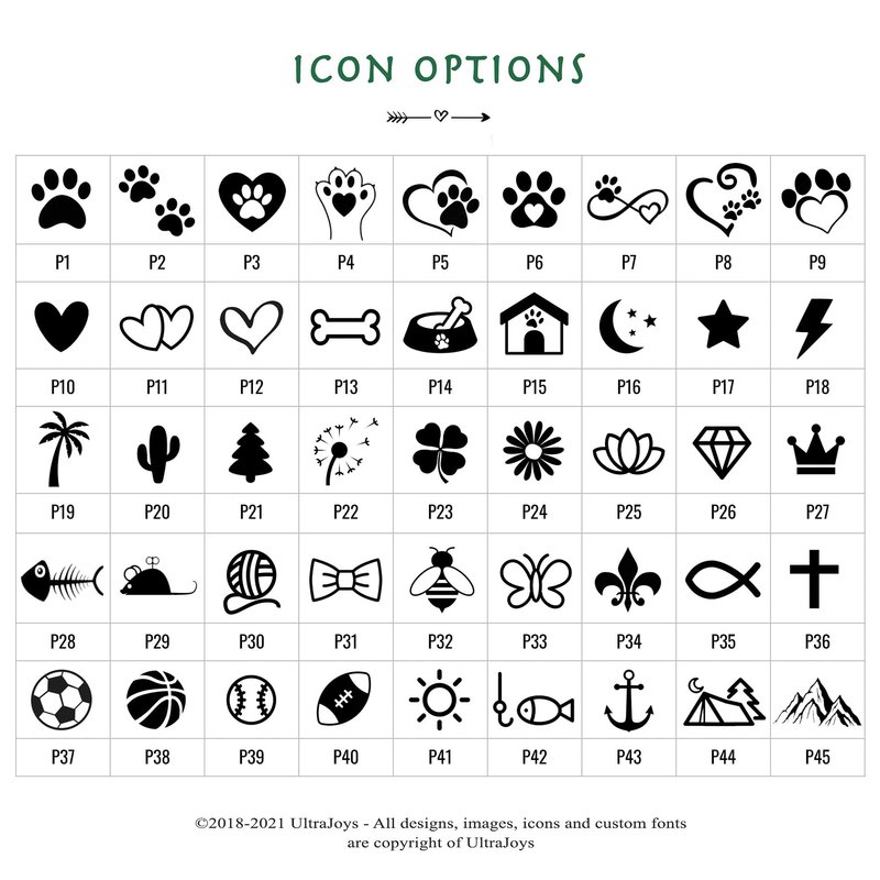 - The sample picture is for display only. It can be personalized with any text with 10 font and 45 cute icon choices, it also can be engraved both side with back engraving options,the front will be your pet name and the back engraving could be phone number, address, 'microchipped' etc.
