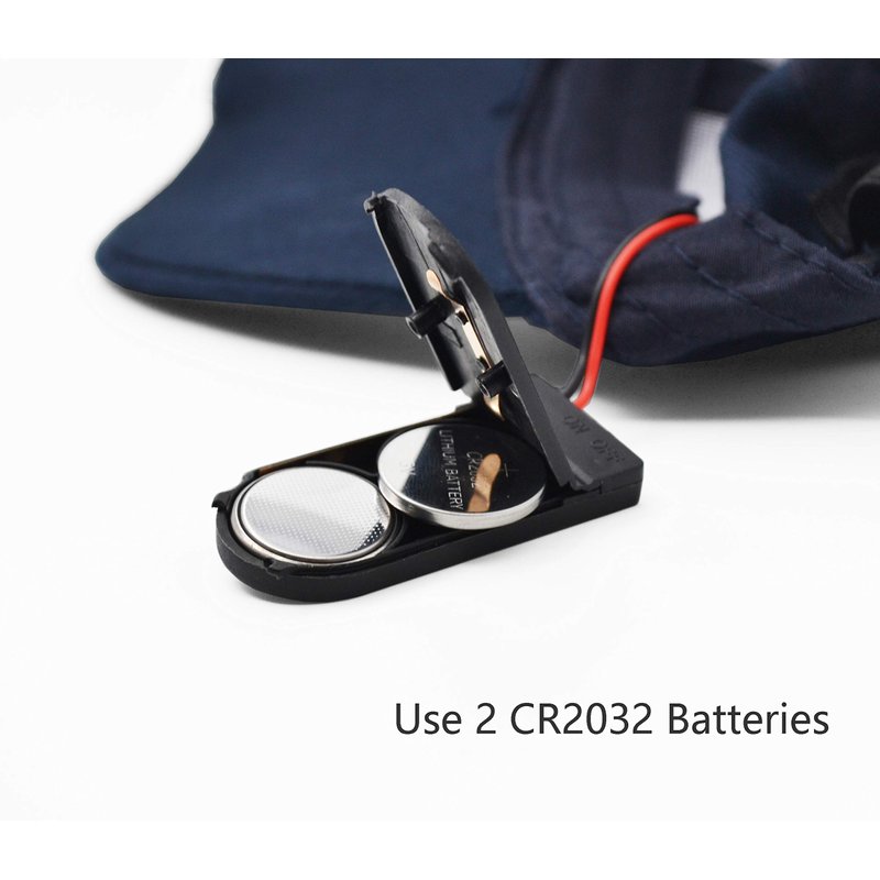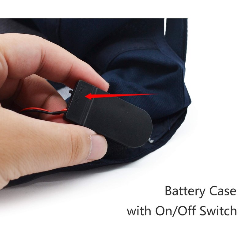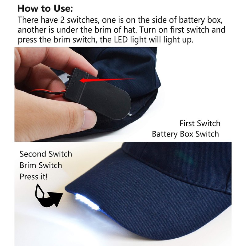 - The product has 2 switches, one is on the side of battery box, another is under the brim of hat. Turn the first switch to on and press the brim switch, the LED light will light up. The brim switch just under the brim of hat. Easy to turn it on or turn it off.