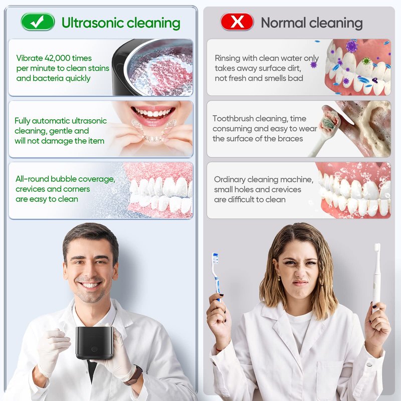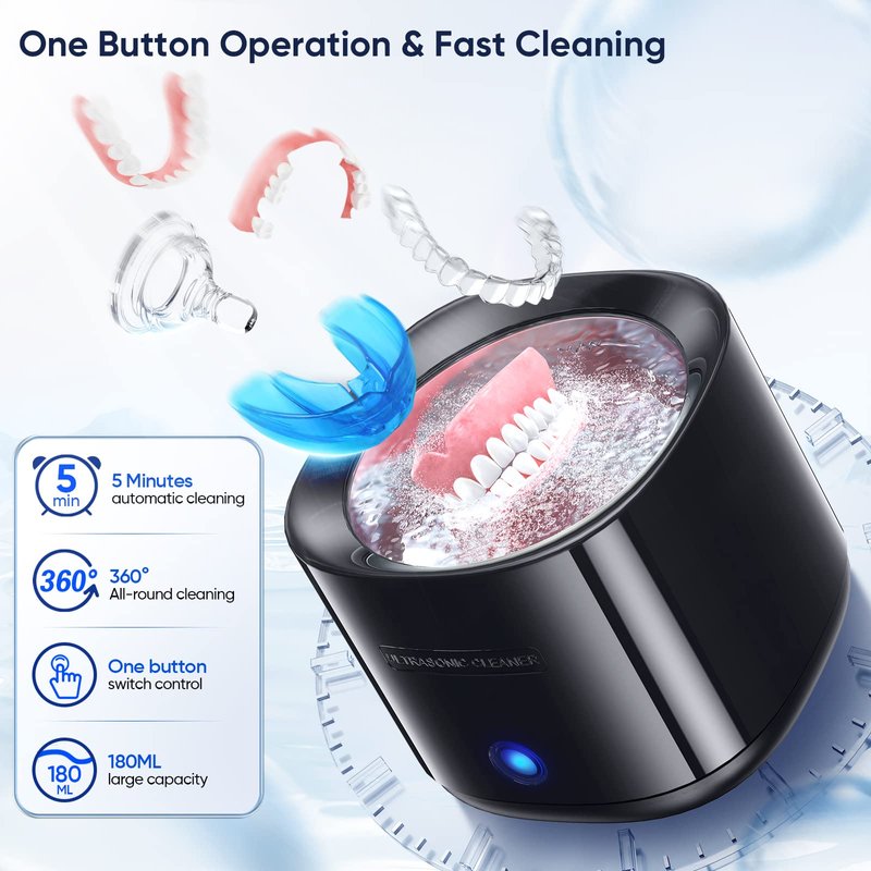 - Ultrasonic Deep Cleaning: The ultrasonic cleaner uses 42,000Hz high frequency sound waves to penetrate into crevices and grooves, covering 360° to net through dirt and effectively remove particles/dirt from dentures, retainers, mouth guards, orthodontics, braces, whitening trays, night guards, jewelry, etc. without damaging delicate items.