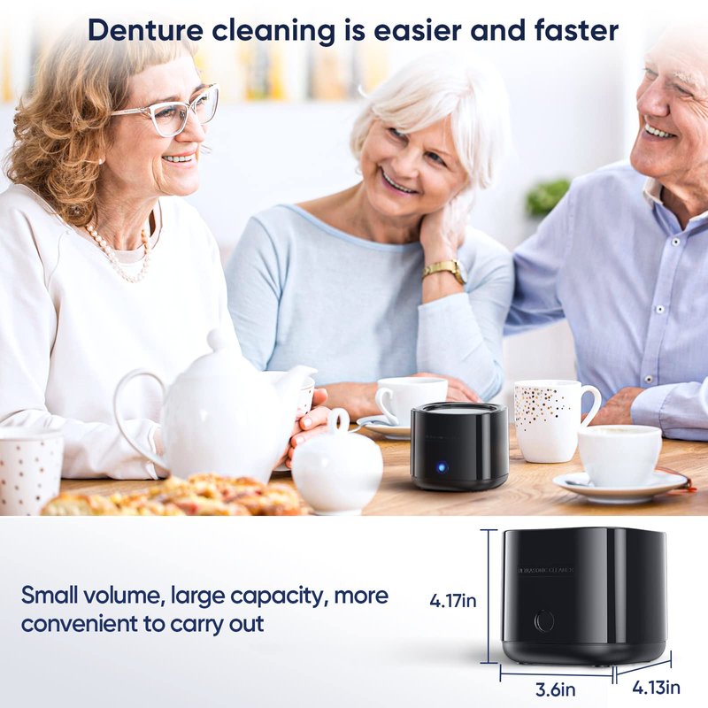 - Large Capacity & Portable: 180ml large capacity is enough to clean denture, braces, jewelry and other items, denture cleaner size 4.17 * 4.13 * 3.62in, weighing only 6.3 ounces, perfect to put on the sink side of the table, does not take up space, when you travel, you can put the ultrasonic cleaner in your suitcase.