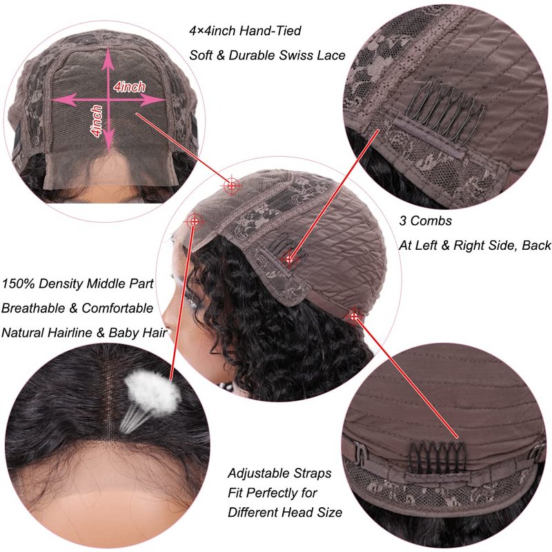 - 【Curly Bob Wigs for Black women Human Hair】150% Density, 4×4 Lace Closure Wig Light Brown Color Swiss Lace,Medium Cap Size(21.5inch-22.5inch),With 3 Combs And Adjustable Straps Make It Fit Most People And Easier To Wear