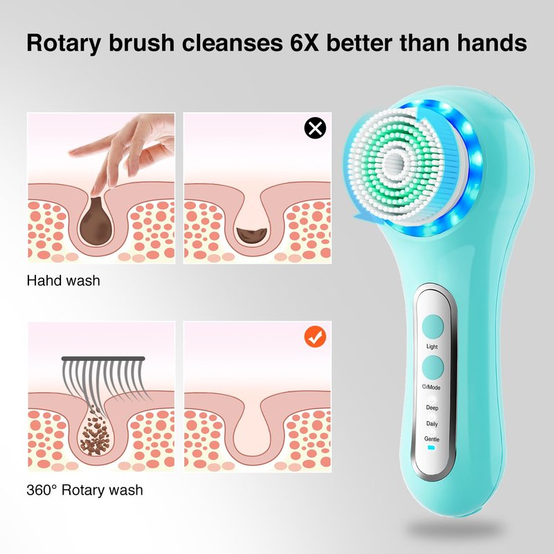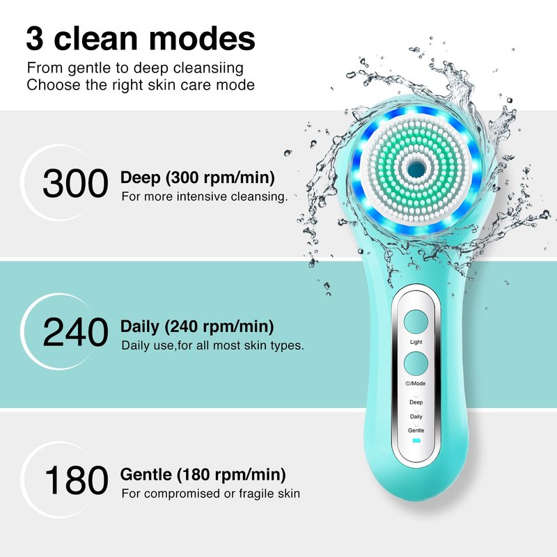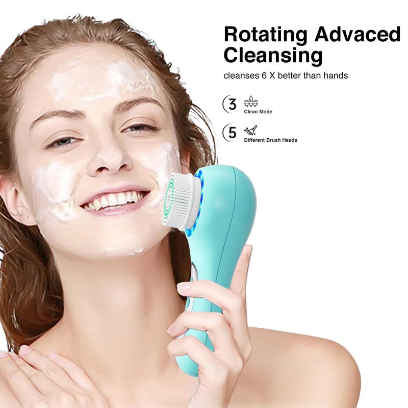 - 3 IN 1 FACIAL CLEANSING BRUSH SYSTEM: Includes 5 brush heads, 3 cleansing speeds (deep, daily, and gentle) for your choice of gentle cleansing to deep exfoliation. Effectively removes dirt, oil and makeup from the skin's surface, and tightens/tones even the most delicate skin.