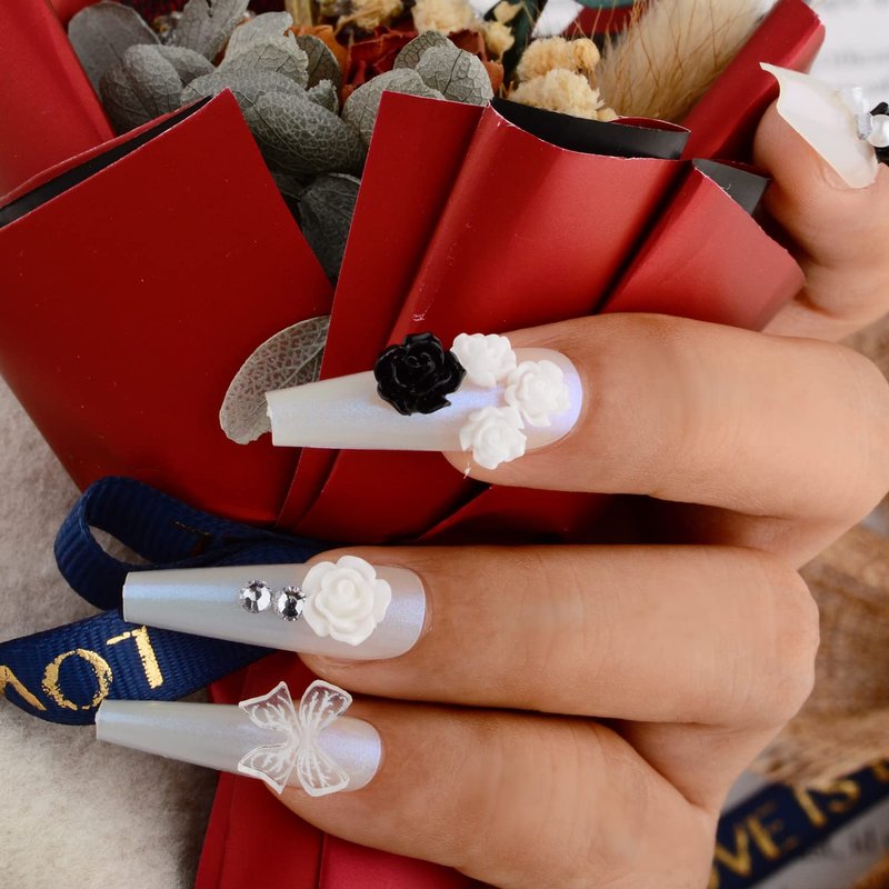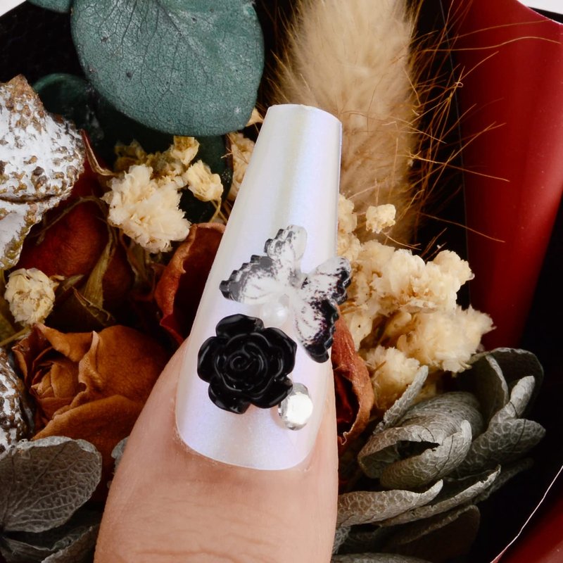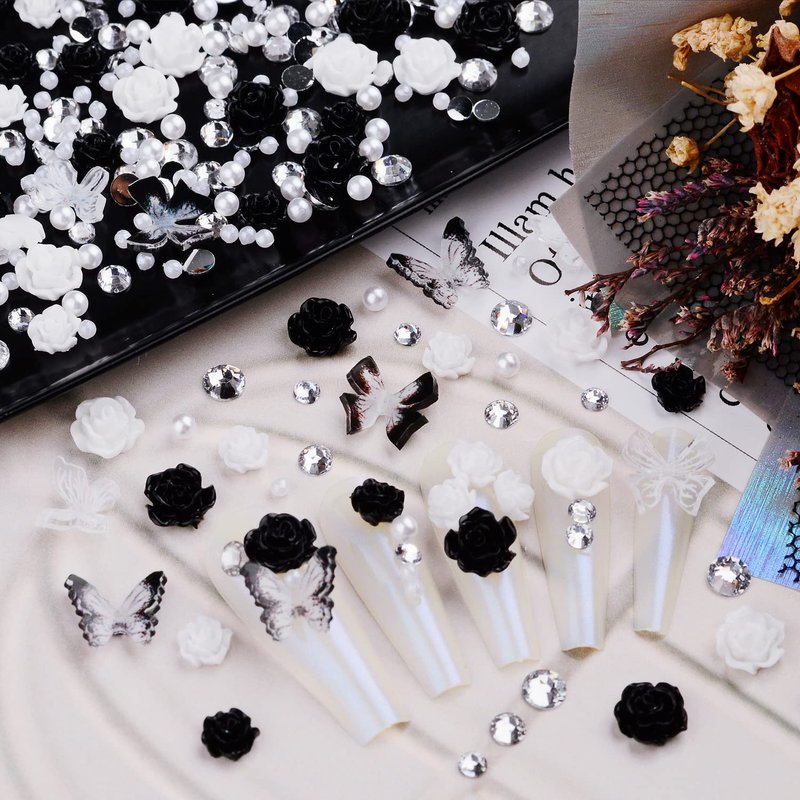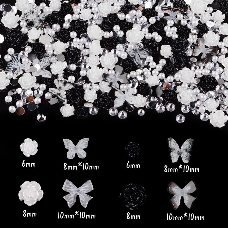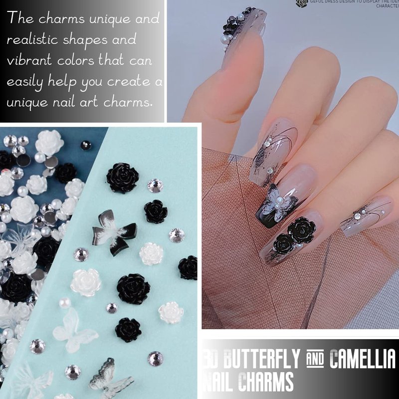 - Package: You will get 100pcs 3D nail design decorations:100pcs mixed black&white camellia rose flower butterfly bow bowknot nail charms with round pearls beads gems and flatback white nail rhinestones.