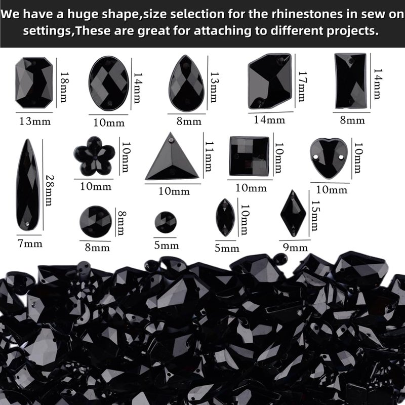 Umillars 500 Pieces Mixed Acrylic Sew on Flatback Rhinestones Crystal Acrylic Gems Diamante for Crafts DIY Dress Clothes Shoes Bag Decorations (Black)