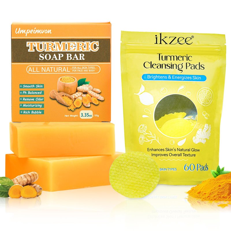 Turmeric Soap Bars & Turmeric Cleansing Pads Turmeric cleanser set gently cleanse, moisturize and smooth skin. Both are excellent at improving skin texture, even skin tone, maintain a skin balance condition. Different format turmeric products bring different convenience for your daily life. Here is a optical choice you won't regret. 3-in-1 turmeric soap uses for face, hands and body. Turmeric cleansing pads are for face, neck, hand. All natural ingredients are suitable for whole family menbers especially those who has skin issues. Turmeric pads for face and body infused rich turmeric extract, vitamin C and vitamin B5 rich in fine foam, it is a disposable cleanser that deeply cleanse and nourish, the pads are convenient to carry with for a trip or travelling.