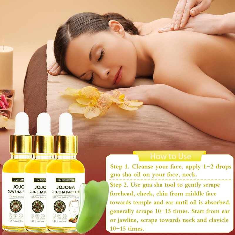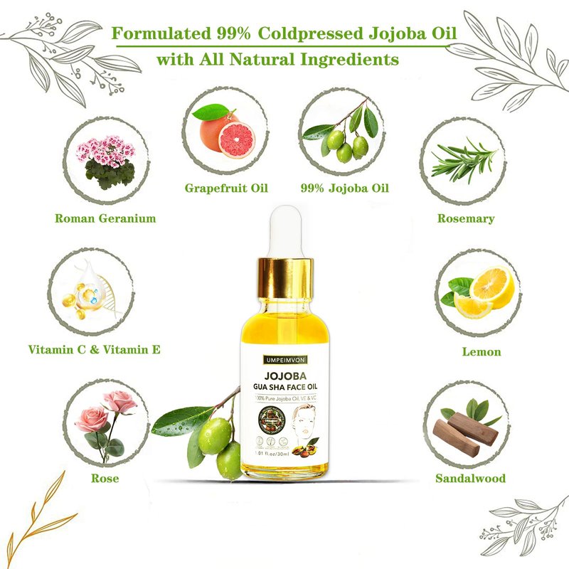 - 【Face Gua Sha Oil】Umpeimvon Gua Sha Oil is perfect for facial oil Gua Sha. With rich jojoba oil, infused with grapefruit oil, roman geranium, rosemary, vitamin e, vitamin c... it moisturizes and nourishes skin, improve skin texture and tone.