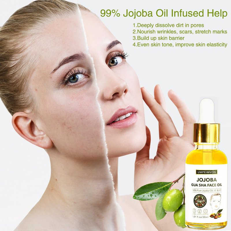 - 【99% Jojoba Oil Infused】Umpeimvon Gua Sha Oil is formulated with 99% Jojoba Oil (ps: the labeling of first batch was wrong). Jojoba lavish minerals, fatty acids, Vitamin E, collagen, vegetable waxes and Mytidyic Acid provide excellent moisture, hydrate and anti-imflammatory functions. According to research, Jojoba Oil is claimed to cure skin disease, promote wound healing.