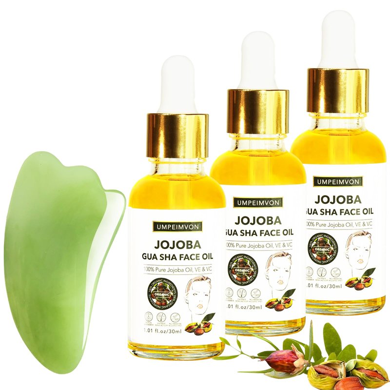 Jojoba Gua Sha Oil for Face Gua sha tool improves circulation, removes impurity, promotes skin elasticity and texture. Umpeimvon Gua sha facial oil combined 99% jojoba oil organic thatwith grapefruit oil, Roman geranium, Rosemary, Lemon, Sandalwood, Rose, Vitamin E, Vitamin C. All natural ingredients, take the most benefit of jojoba to nourish skin as well as hair growth, nails, makeup remover and also can be used as dermaplane oil.