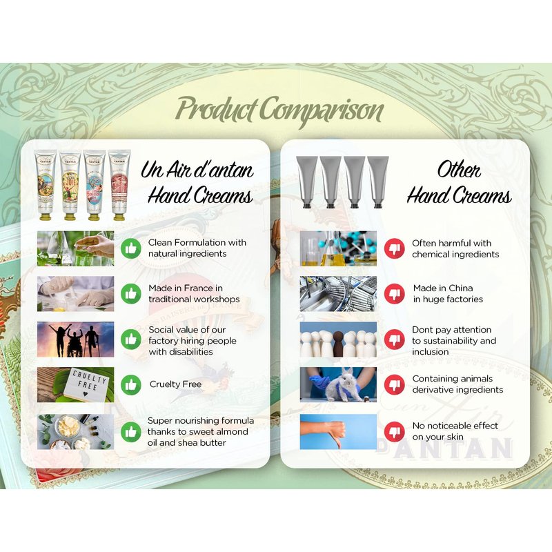 A Lovely Gift Box containing our collection of 5 luxury hand creams. Intensive And Super Moisturizing Formula enriched with shea butter, aloe vera or almond oil . For normal to very dry hands. Instantly absorbs and non sticky. A perfect assortment of travel size hand lotion. 5x0.84 Fl Oz5 Women Fragrances Included: La Vie En Rose: Rose, Peach, & Patchouli, Provence: Verbena, Bergamote, Fleurs Cerisiers: Cherry blossom, and Freesia, Douce : Almond, Fig and Vetiver, and Joie: Rose, Lily of the Valley and Orange Blossom.Presente In An Adorable Vintage Keepsake Box Made In France With Love.Made Avec Amour: Un Air d’Antan skin care products are dermatologically tested and pH physiological. Completely free from animal-testing (PETA). Paraben and Sulfate Free (no SLS). Un Air d'Antan Is A Family Story First And Foremost. A brand of traditional cosmetics made in France, inspired by retro culture and French songs. Our fragrances are created in Grasse (Provence), the world capital of perfumes. Friendly ideas for small gifts, gifts for her, gifts for mum, hamper basket, ladies gifts, mum gifts, friendship gifts, xmas gifts for women, christmas eve box fillers, women gifts, gift sets, womens gifts, christmas hamper, sister gifts, presents for women.