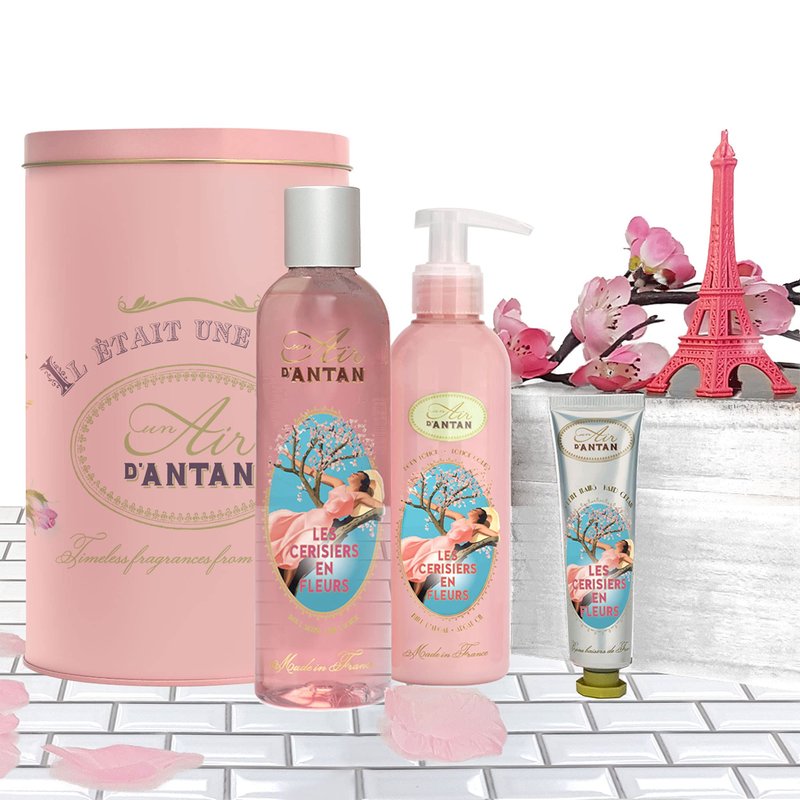 🌸 OUR FRENCH GIFT SET FOR WOMEN contains our Cherry Blossom range with spring notes of Cherry Blossom and Freesia. Contains 1 SHOWER GEL 0.87 Fl Oz, 1 BODY CREAM 7.03 Fl Oz, 1 HAND CREAM 0.87 Fl Oz. Presented in a lovely metal box.