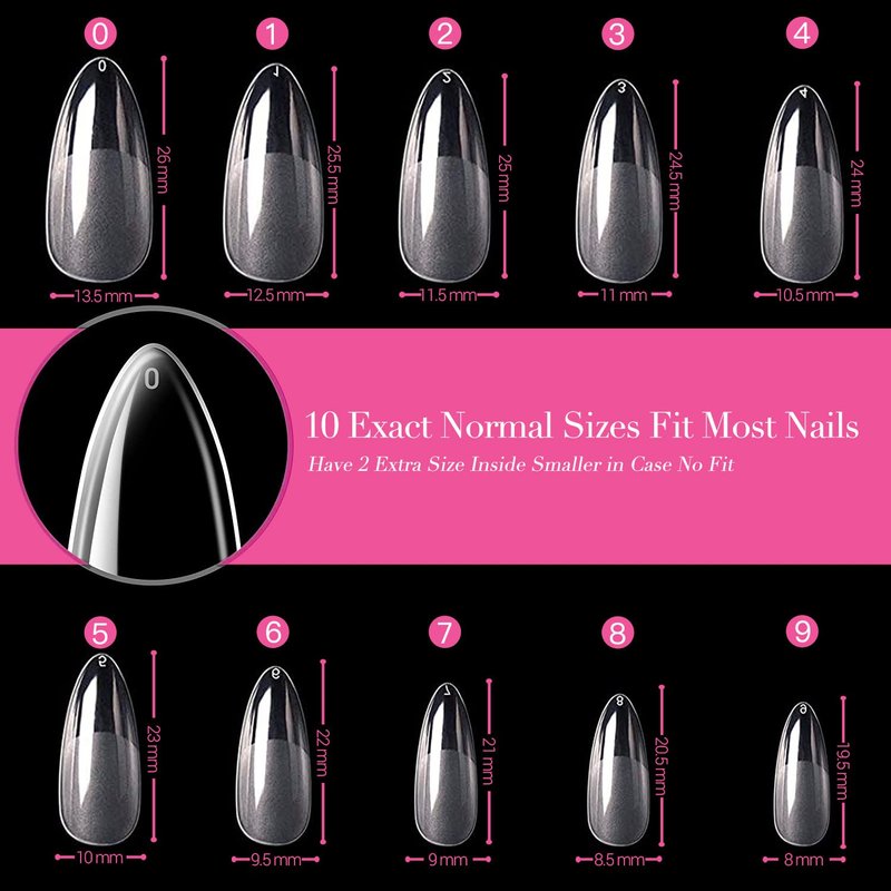 - ❤12 Sizes Tips Fit Your Nails: Out clear almond tips contain 12 sizes with size number on the top of the tips can easy pick proper tips for your nail. And 2 extra size can suit bigger or smaller nails, in case 10size can not fit few of your nails.