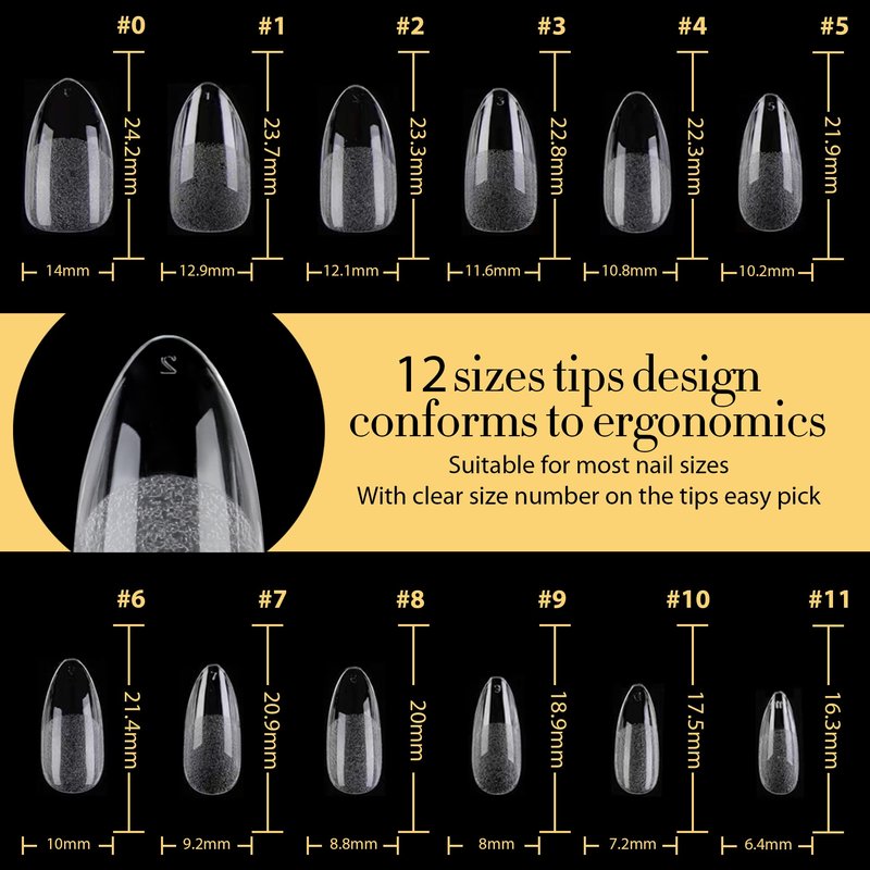 - ❤️12 Sizes Nail Tips: Our Almond clear tips come in 12 sizes, perfect for all nail shapes and sizes. Each tip is made with the perfect length and thickness, and two extra sizes are included to accommodate larger or smaller nails.