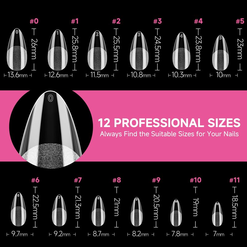 - ❤【12 Sizes Tips Fit Your Nails】Our clear almond tips contain 12 sizes with size number on the top of the tips can easy pick proper tips for your nail. And 2 extra size can suit bigger or smaller nails, in case 10size can not fit few of your nails.