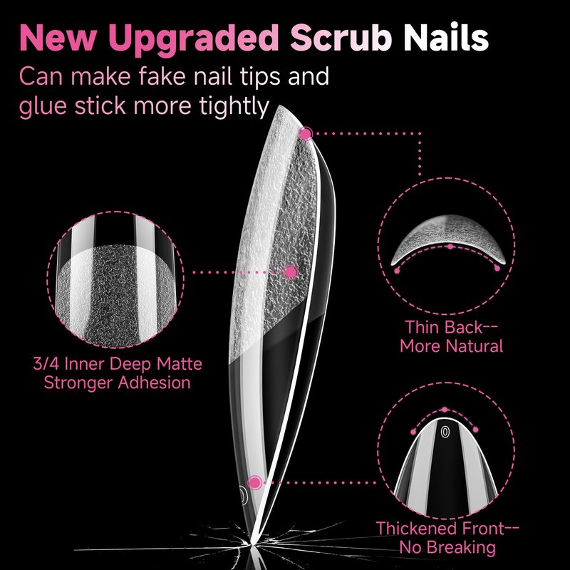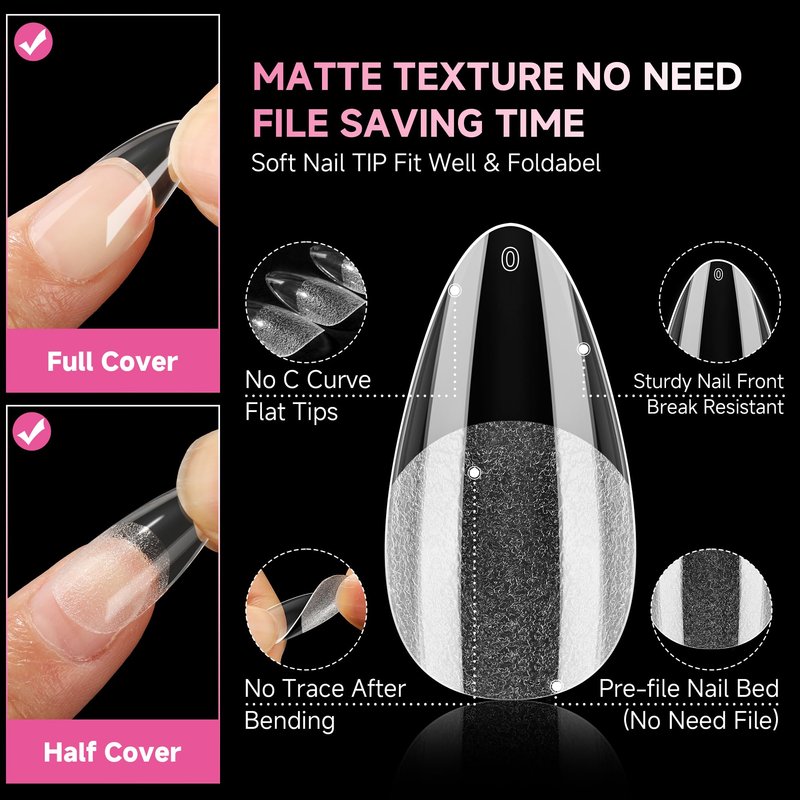 - ❤【Updated 3/4 Inner Deep Matte】 Our medium almond nail tips have been upgraded with 3/4 inner deep matte texture, providing stronger adhesion to your natural nails. The almond nail tips are pre etched, saving your time to file nail bed.