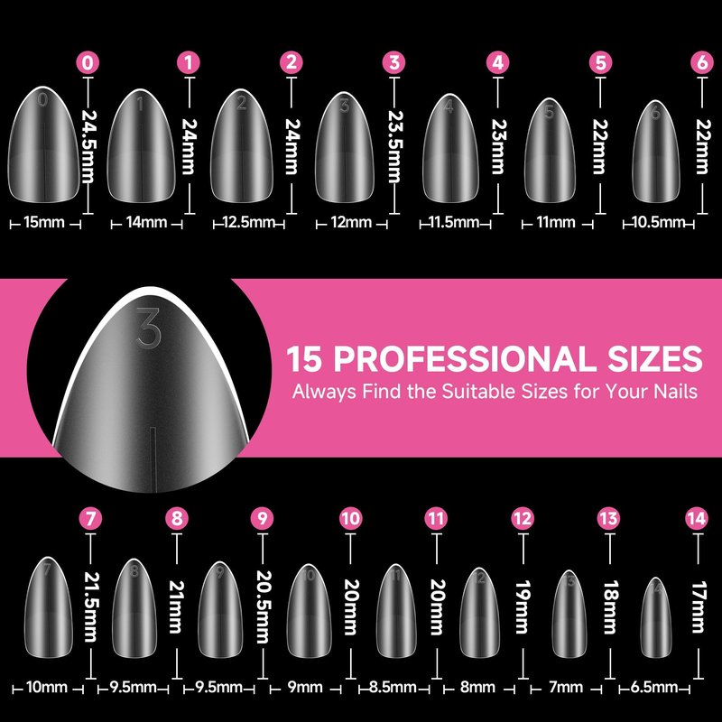 - ❤️【15 Sizes Tips Fit Your Nails】Our almond tips contain 15 sizes with size number on the top of the tips can easy pick proper tips for your nail. Additionally, three extra sizes are provided to fit larger fingernails in case some of the 12 standard sizes do not fit your nails.