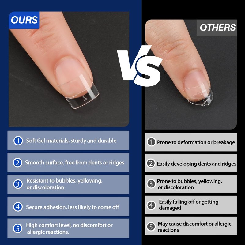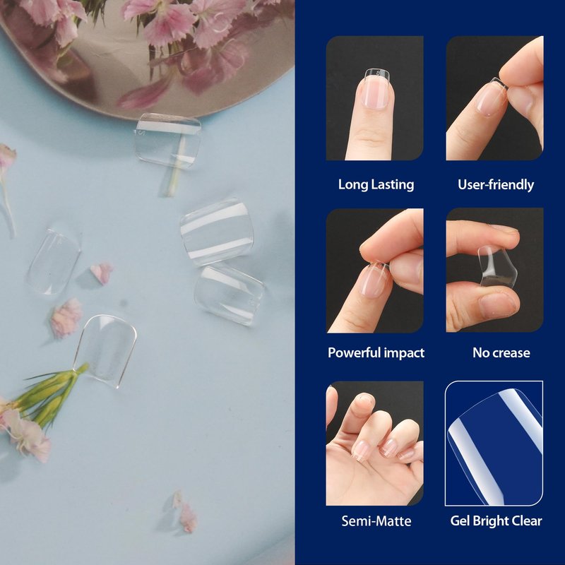 - 💅Natural Fit Effect: The extra short square gel x nail tips feature “ Thin back edge, thick front edge”. The thinner back edge can make the full nail tips fit your nails better. The clear nail tips makes the color more visible.The thickened front edge makes it not easy to break or bend, having longer lifespan. Just like your natural nails!