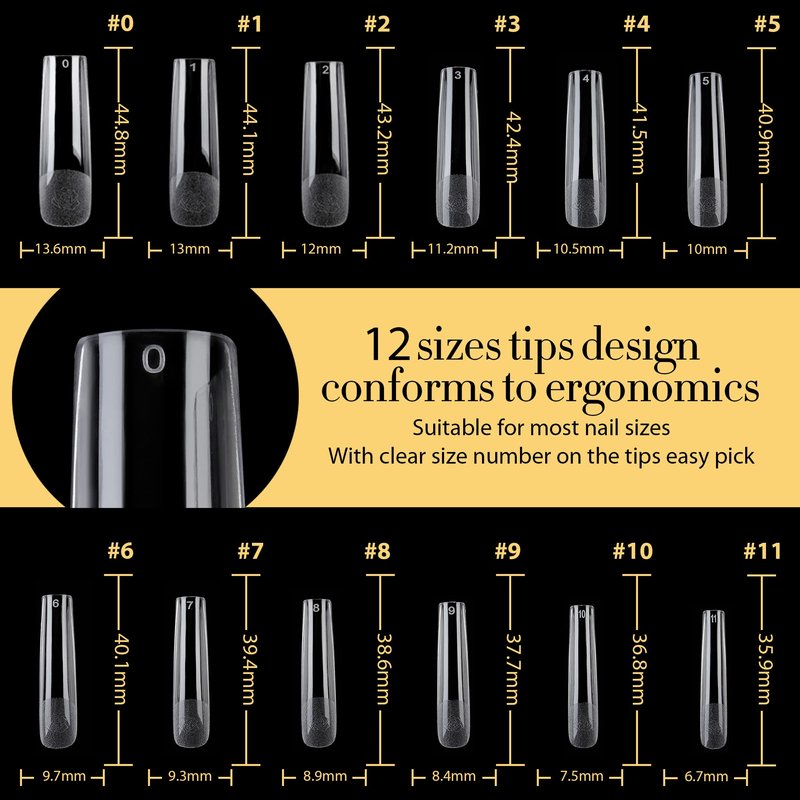 - ❤️12 Sizes Nail Tips : Tapered Square nail tips clear with 12 sizes are suitable for all kinds of nail satisfying various needs. Made with perfect length and thickness. And 2 extra size can suit bigger or smaller nails, in case 10size can not fit few of your nails.