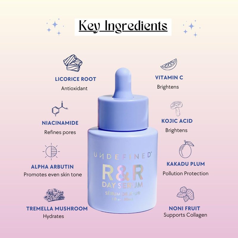 Undefined Beauty R&R Day Serum, Daily Brightening Serum infused with Vitamin C, Kojic Acid, Niacinamide, Alpha Arbutin, Licorice Root