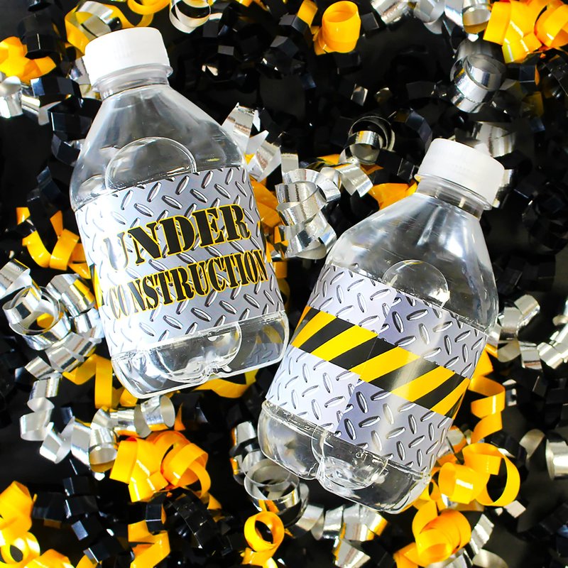 - 24 COUNT: Under Construction Party water bottle labels feature a steel background and caution tape design made to match Under Construction Birthday Party decorations for a dirty 3rdy birthday.