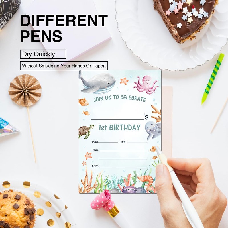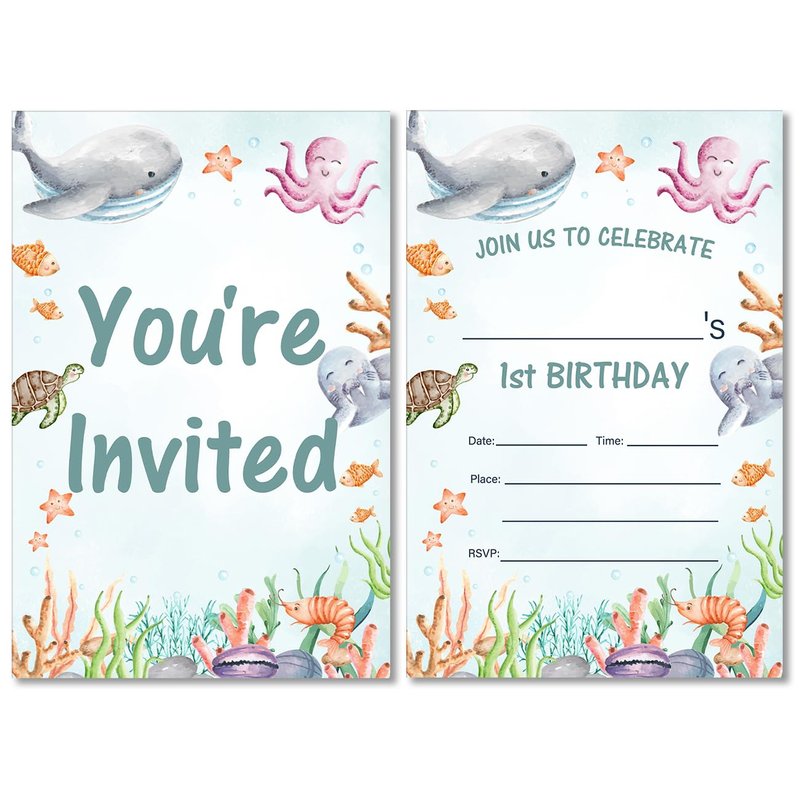 Under the Sea First Birthday Invitations with Envelopes Set of 20 Watercolors Whale Turtle Shark Jellyfish Sea Life 1st Birthday Party Invites Fill in Blank