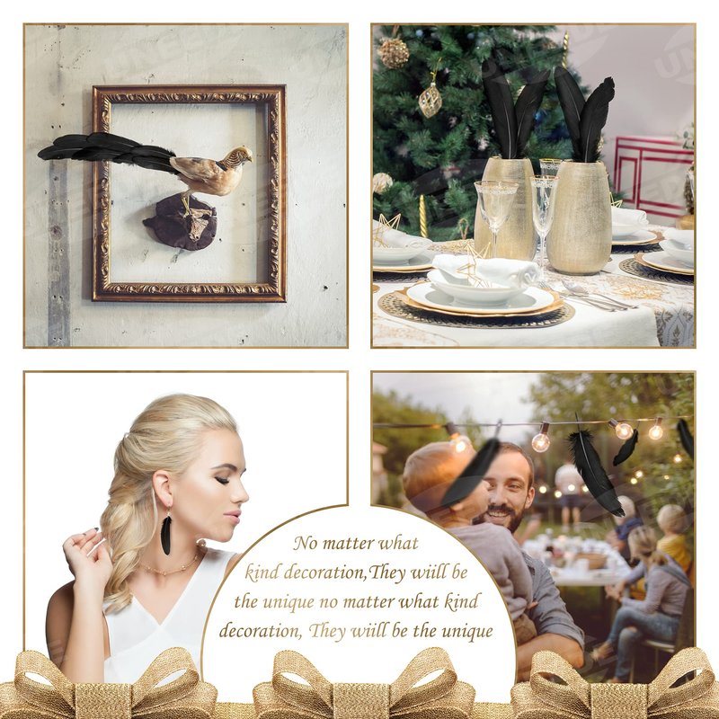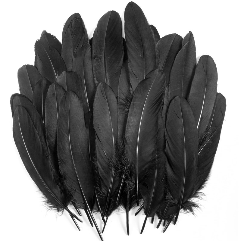 Specification Material: Real Goose Feather Weight: 20g Length: 6~8 inches Width: 0.9~1.6 inches Color: black feather Packing quantity: 120Pcs feathers Features The black natural feathers are very special and beautiful and can be used for many DIY projects. It is not only cute and simple For any room decoration, you can also use them to make bohemian-style feather garlands and put them in dream catchers, DIY masks, Vases and so on. It will add beautiful effects when decorating birthday parties, 20s themed parties, bohemian themed parties, baby shower decorations, etc. Use these beautiful feathers to stimulate your imagination, create more DIY projects, and make your life brighter and more beautiful.
