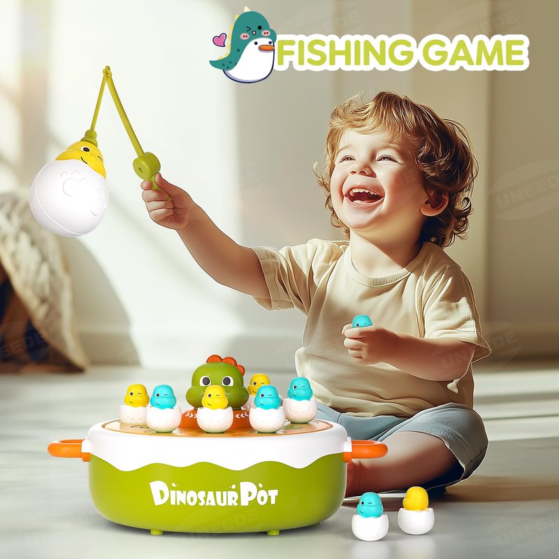 - 【Engaging Hunting and Fishing Games】Kick off the excitement with a dynamic hunting game! Turn on the switch, and the music begins as the turntable spins. Kids can use the catching net to snag bouncing dinosaurs or try fishing for magnetic dinos with the fishing rod. Both games are designed to enhance fine motor skills and focus, making playtime both entertaining and beneficial.