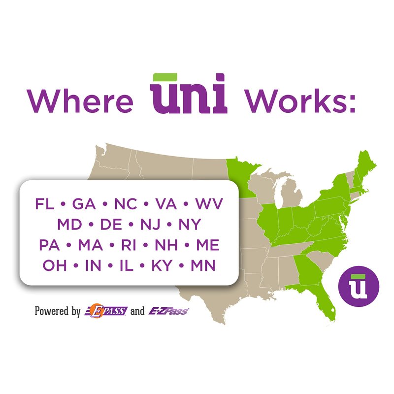 Uni lets you travel nonstop through 19 states with just one toll account. Use your Uni on toll roads in the following states: Florida, Delaware, Georgia, Illinois, Indiana, Kentucky, Maine, Maryland, Massachusetts, Minnesota, New Hampshire, New Jersey, New York, North Carolina, Ohio, Pennsylvania, Rhode Island, Virginia, and West Virginia. With Uni by E-PASS, there are no monthly account fees, and your prepaid toll credit never expires. When traveling in the Orlando area, E-PASS customers receive additional discounts on local toll roads. Note: Please remove any other toll transponder(s) from your vehicle before installing your new Uni to avoid duplicate toll transaction charges. Formerly named E-PASS Xtra. Visit GoWithUni.com to learn more and to set up your Uni prepaid toll account.