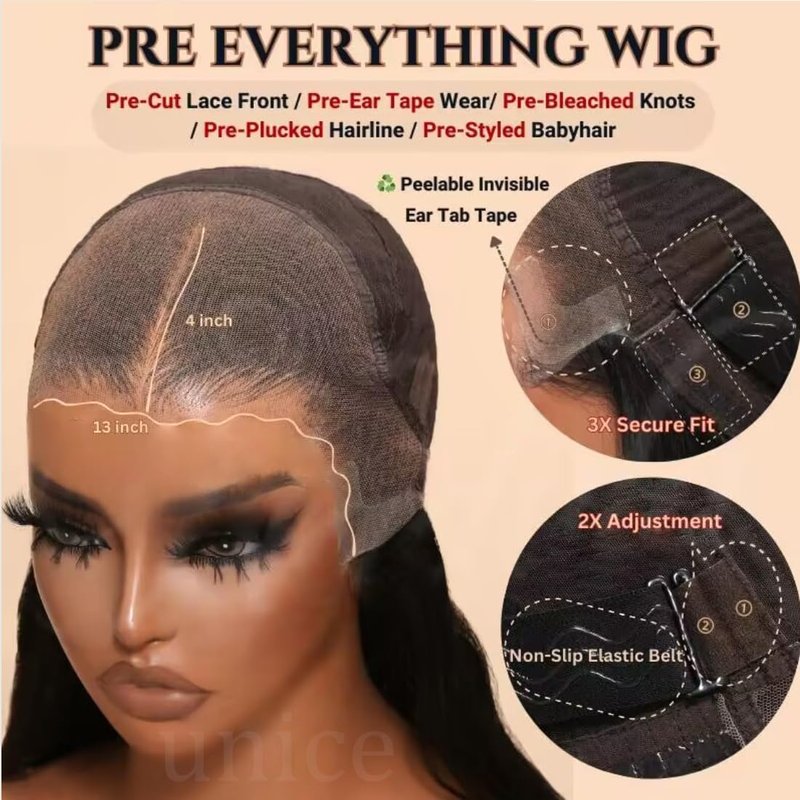 Wig Style: UNICE Glueless Frontal Wig Body Wave pre cut 13X4 hd lace glueless wig wear and go human hair pre plucked natural hairline 30 seconds to wear, quick and easy, no skills needed, beginner friendly. Pre Bleached Invisible Bye Bye Knots Wig that you don’t have to bleach them.