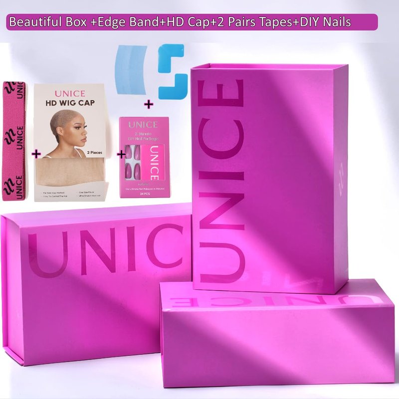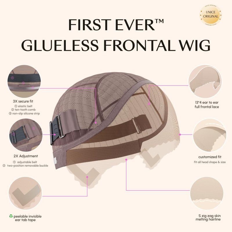 - 1.Glueless Lace Front wig Human Hair material: UNICE First Ever Pre Everything Glueless Frontal Wig upgrade 13X4 hd lace front wig 100% virgin human hair, collect from young girl donors. No shedding no tangle can be restyled .