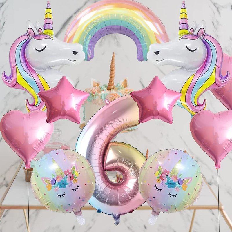 - Unicorn Foil Balloon Set: Iridescent Unicorn Balloon x2, Large Rainbow Balloon x1, Round Unciorn Balloon x1, Number Balloon x1,Pink Heart Star Balloon x 4