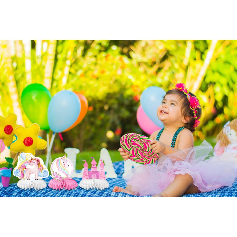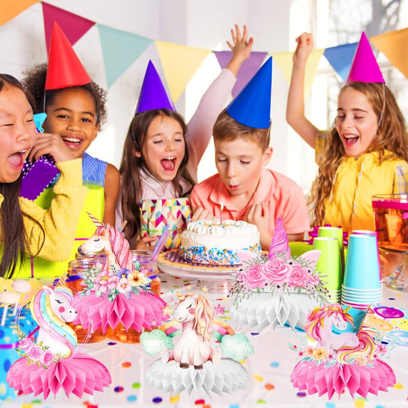 - Rainbow Unicorn Decorations: The shiny unicorn honeycomb table toppers are designed with 8 pieces of different designs, including unicorn, castle, flowers, unicorn horn and rainbow in the background, that can be used as table decorations for a birthday party or any other celebration